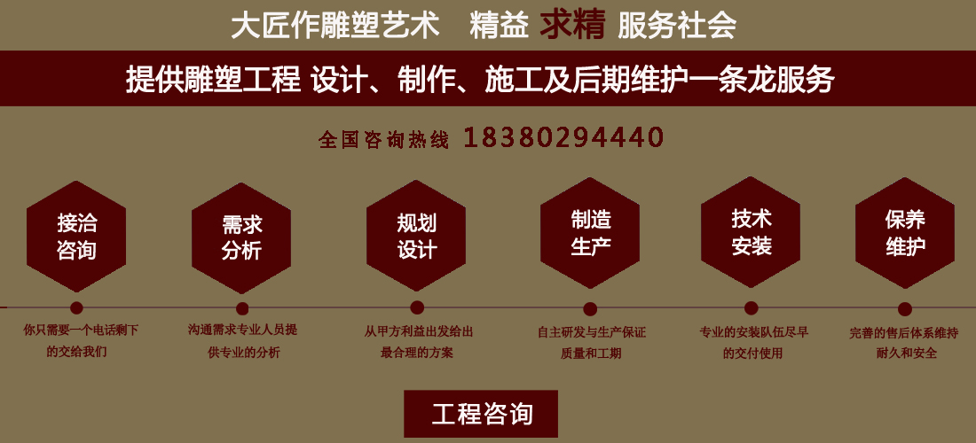 成都大匠作雕塑有限公司,是經(jīng)成都工商局審定注冊的正規(guī)專業(yè)雕塑制作及工程安裝服務(wù)機(jī)構(gòu),是由一群年輕富有朝氣的年輕人創(chuàng)辦,發(fā)軔于四川省成都市龍泉驛區(qū)。它是一家******于創(chuàng)作、制作和銷售為一體的公司。大匠作擁有多年從事公共藝術(shù)的專業(yè)人員和雕塑制作人組成的核心團(tuán)隊,為您提供專業(yè)、具創(chuàng)新的設(shè)計及制作服務(wù)。公司成立以來,秉承“******服務(wù)、誠信為本”的宗旨,以客戶需求為目標(biāo)導(dǎo)向,不斷學(xué)習(xí),進(jìn)取,優(yōu)化和提高服務(wù)質(zhì)量,公司向您******——“您的滿意***是我們的信譽(yù)”,我們將以飽滿的熱情和******的服務(wù)贏得您的贊譽(yù)和支持。
